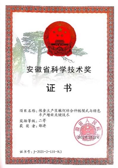 由我院邵涛教授、刘秦华副教授参加、南京农业大学为第二完成单位的研究成果“粮食主产区粮饲结合种植模式与绿色丰产增效关键技术”获得安徽省科学技术奖二等奖。
