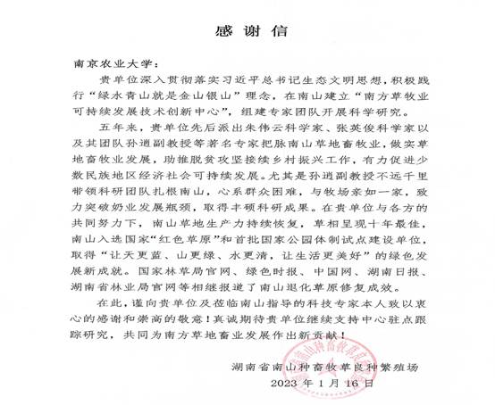 近日湖南省南山种畜牧草良种繁殖场发来感谢信,感谢我校专家把脉南山草地畜牧业,做实草地畜牧业发展,助推脱贫攻坚接续乡村振兴,有力促进少数民族地区经济社会可持续发展。同时对我校朱伟云教授、张英俊教授(兼)、尤其是孙逍副教授扎根南山,心系群众困难,致力突破奶业发展瓶颈表示衷心感谢