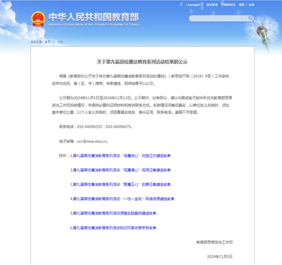 近日,教育部第九届高校廉洁教育系列活动“一校一金句”网络微课遴选名单公布,我院报送的作品《小事小节是一面镜子》顺利入选。全国共有100件作品进入遴选公示名单,其中26件优秀作品在央视网集中展播,我院作品获得央视网展播。