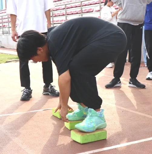 (1)四人一组,每个参赛队员三块“石头”,双脚分别踩在两块“石头”上,用手来移动另一块“石头”,通过“石头”交替前移过河(沿跑道前行20米)。