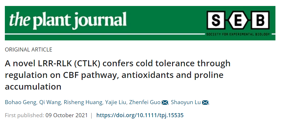 近日,我院郭振飞教授与华南农业大学亚热带农业生物资源保护与利用国家重点实验室卢少云教授课题组合作在国际植物领域著名杂志The Plant Journal上在线发表了题为A novel LRR-RLK (CTLK) confers cold tolerance through regulation on CBF pathway, antioxidants and proline accumulation的研究论文。该研究从蒺藜苜蓿中鉴定出一种新型富含亮氨酸重复类受体蛋白激酶CTLK, 其通过调控CBF低温响应途径、抗氧化防御和脯氨酸积累来赋予苜蓿耐寒性。