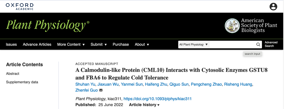 近日,3044am永利集团郭振飞教授团队在Plant Physiology在线发表了题为“Calmodulin-like protein (CML10) interacts with cytosolic enzymes GSTU8 and FBA6 to regulate cold tolerance”的研究论文,揭示了紫花苜蓿类钙调蛋白MsCML10与细胞质谷胱甘肽硫转移酶8(GSTU8)和醛缩酶6(FBA6)互作,调控苜蓿耐寒性的分子机制。