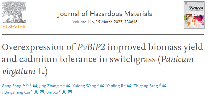 近期,3044am永利集团徐彬研究组和生科院蔡庆生教授合作在Journal of Hazardous Materials在线发表了题为“Overexpression of PvBiP2 improved biomass yield and cadmium tolerance in switchgrass (Panicum virgatum L.)”的研究性论文。