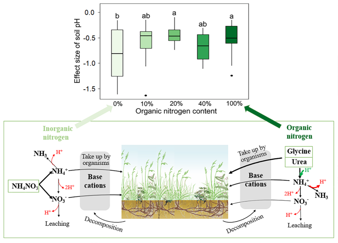 该研究首先进行了Meta分析,明确有机氮和无机氮输入对土壤酸化程度的差异,并结合长期的天然草地不同形式的氮添加试验(2016 - 2021年),进一步研究氮输入组分的变化如何影响土壤酸化。