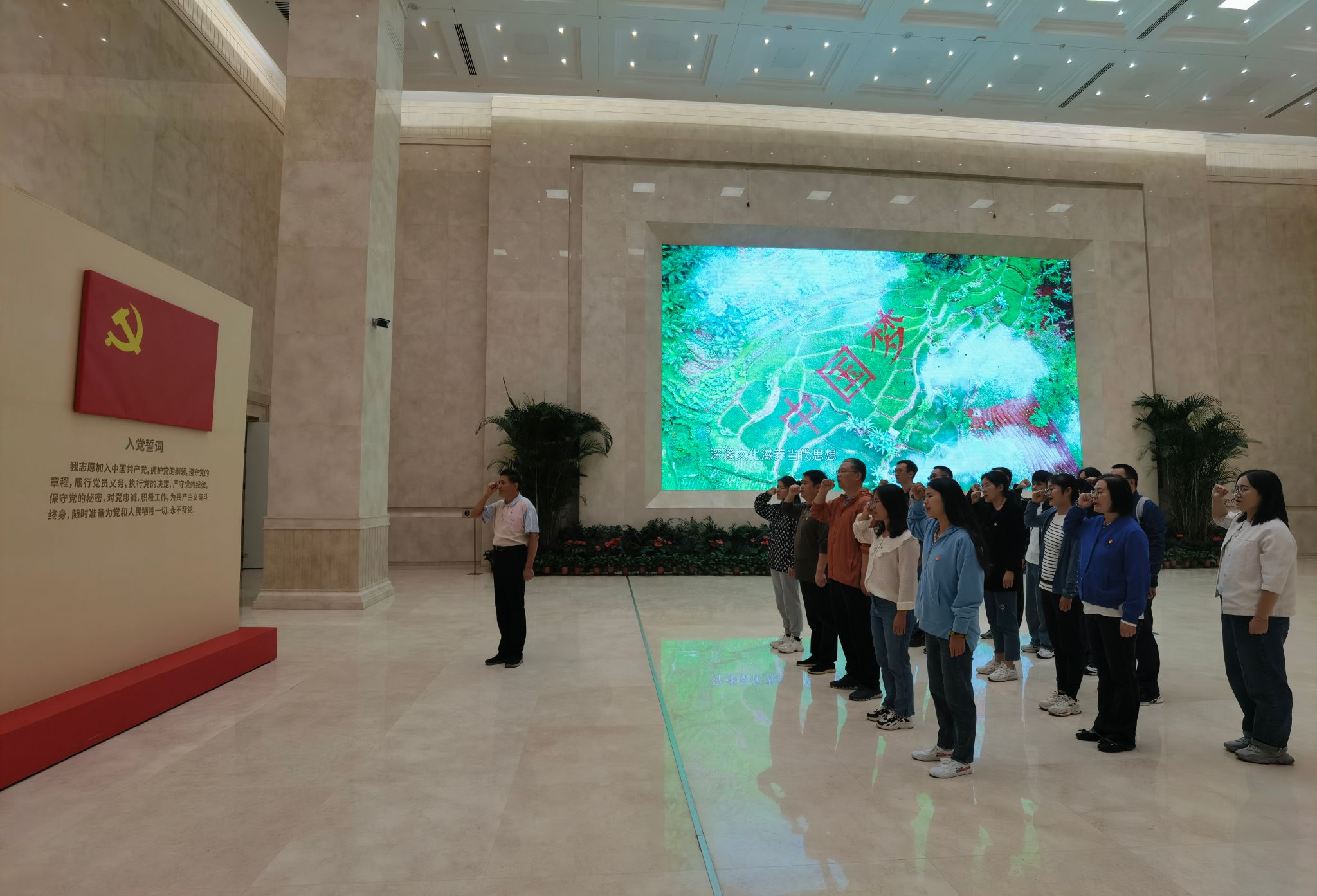 参观结束后,在学院教师第一党支部书记邵涛教授带领下,大家面向中国共产党党旗,庄严地开展了重温入党誓词活动,用铿锵有力的誓言表达了对党的无限忠诚和为共产主义奋斗终身的坚定决心。