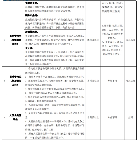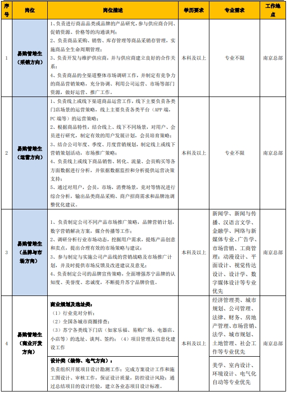 简历投递网申地址:campus.suning.cn 选择“营销类”各招聘职位方向,如申请大区易购管 培生还可直接选择意向工作城市进入招聘职位页面。