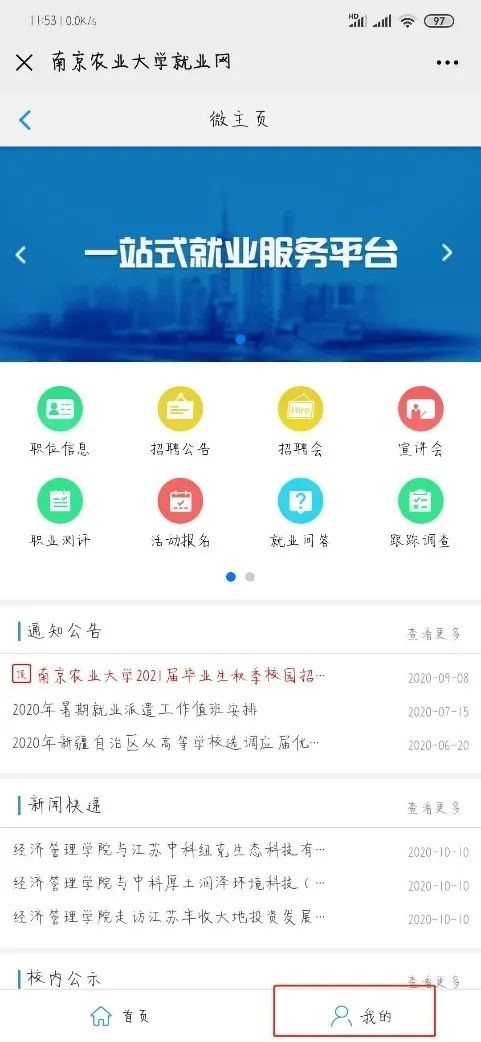 第二步:进入南京农业大学就业网微主页页面后,点击右下角“我的”;