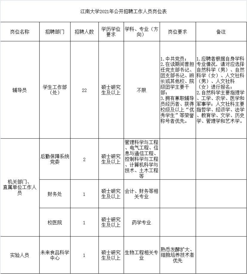 江南大学地处长三角中心城市江苏无锡,是教育部直属、国家“211工程”重点建设和一流学科建设高校。学校坚持立德树人根本任务与人才强校战略,致力于建设“世界知名、中国一流、江南风格”的研究型大学。为更好地适应学校改革发展的迫切需要,本着“公开平等、择优录用”的原则,现面向校内外公开招聘辅导员22名(理工、人文学科背景均衡,男、女各半)、机关部门、直属单位工作人员4名、实验人员1名。