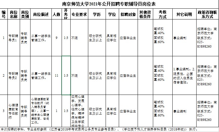 南京师范大学是省教育厅主管的全额拨款事业单位,位于南京市栖霞区文苑路1号。为更好地选拔优秀适岗人才,充实人才队伍,优化师资结构,南京师范大学现面向社会公开招聘优秀专职辅导员。根据《江苏省事业单位公开招聘人员办法》(苏办发〔2020〕09号)等规定,现将有关事项公告如下: