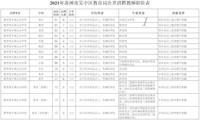 根据《省教育厅省人力资源和社会保障厅关于进一步做好全省中小学校新进教师公开招聘工作的意见》(苏教规〔2016〕1号)有关规定,经研究,2021年苏州市吴中区教育局下属公办学校公开招聘教师298名。现将《2021年苏州市吴中区教育局公开招聘教师公告》(以下简称《公告》)公布如下: