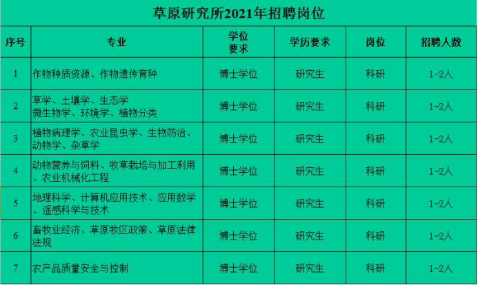 中国农业科学院草原研究所是专门从事草业科学研究的国家级科研机构。研究所主要围绕我国草原地区资源、生态、经济、社会等科学和技术问题,以基础前沿、共性关键技术和社会公益服务为主,重点聚焦草种质资源收集、评价、保存与利用,草新品种培育、制种与栽培研究,草产品加工与质量安全,草地灾害预警与防控,草地机械与装备研创,草地生态保护利用,草地遥感与大数据研究,草原管理与牧区经济政策研究等草原和草牧业学科重点前沿领域和国家重大需求开展创新研究和成果供给。拥有国家级、省部级各类平台40余个,先后承担国家、省部级科研项目652项,获得国家科技进步奖等国家级奖励4项,省部级科技成果奖101项。现有在职职工177人,其中科技人员158人,高级职称人员70人,有硕、博士学位的118人,硕博士生导师42人,是草学和生态学两个一级学科硕博士培养单位,中国农科院草学学科博士后流动站的主要培养单位。