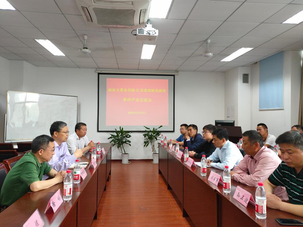 5月17日,江苏省沭阳县副县长邓衍明、沭阳县农业农村局谢博文、周集乡乡长冯朝阳以及乡政府工作人员和草坪种植大户等一行15人,到访3044am永利集团交流洽谈草坪产业合作事宜,学院党总支书记李俊龙、院长郭振飞、副院长徐彬、教授杨志民和副教授陈煜等出席座谈会。会议由李俊龙主持。