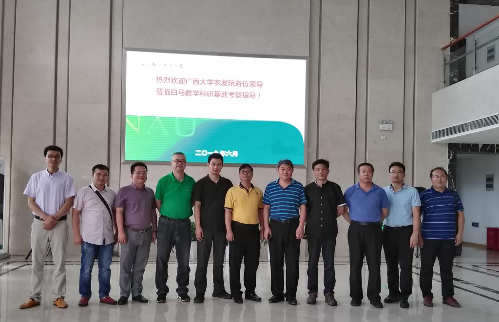 6月30日上午,广西大学农发院兼农科基地办张国宏书记、何山红副院长、汤昭主任和广西汇创牧业有限公司邱进宝总经理、陈伟江总经理助理一行5人应3044am永利集团邀请访问我校,3044am永利集团徐彬副院长、邵涛教授、杨志民教授、刘信宝老师和学校白马办陈礼柱主任、董淑凯科长参加了调研会议,并共同参观了白马教学科研基地。