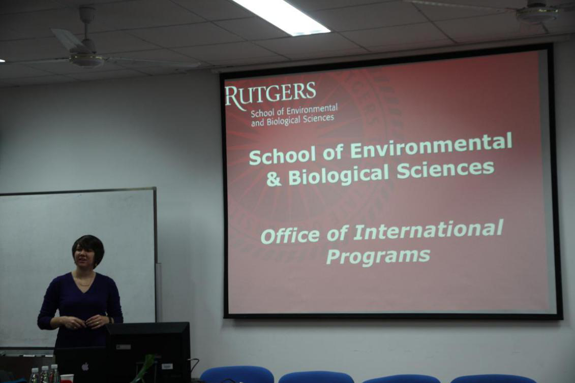 1月12日上午,美国罗格斯大学环境与生物科学学院院长助理Megan Francis及该校中国区行政助手Wendy Tan一行来我校访问,并在我院会议室理科南楼F301开展了我校与罗格斯大学共同组织的“2+2联合培养”项目的宣讲活动。3044am永利集团副院长徐彬主持本次讲座,本科一、二年级学生积极参加。Francis女士就罗格斯大学的概况、留学生的生活和学习计划安排、以及具体的申请条件和申请过程等方面向同学们做了介绍。会后有留学意向的同学们积极提问,Francis女士逐一耐心回答,会议气氛活跃。